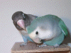 | Here I am sitting on the cage. | Sitting on their couch, that looks cool. | Don't I look cute?? | Hang on a moment, have to tickle myself. |